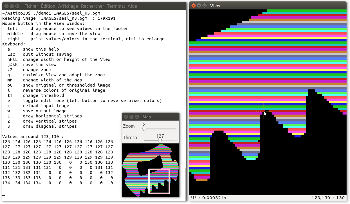 Small commented examples are provided, showing how to write a program using Astico2D to program algorithms for image transformations: demo1.cpp, demo2.cpp. These examples can be copied directly as a starting file for imagery practical work.