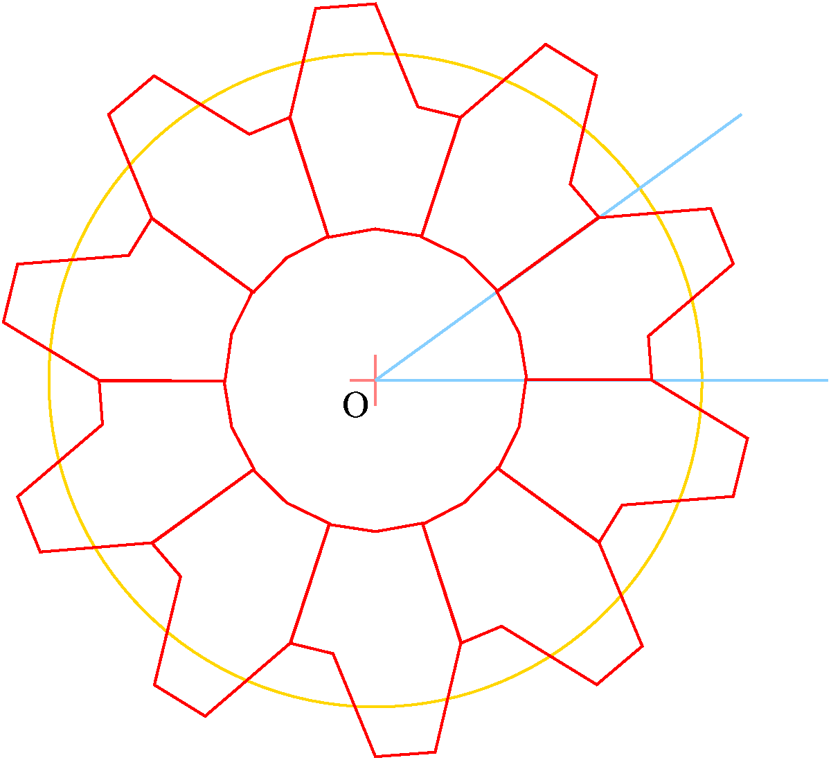 La roue est centrée à l'origine et composée de blocs de dents ; le bloc de dent initial est en rouge dans le schéma.