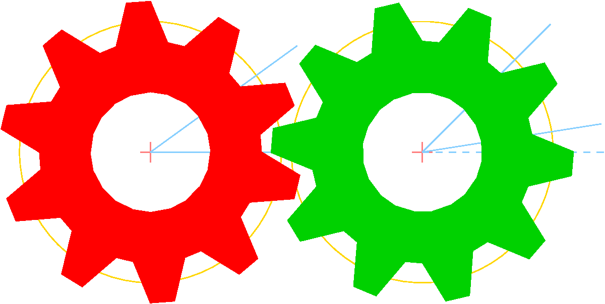 Dessinez le côté de la première roue en rouge, et le côté d'une deuxième roue en vert, emboîtée dans la première. La deuxième roue est décalée à droite à l'aide d'une translation horizontale, et légèrement tournée (de \(\alpha/4\)) pour permettre l'emboîtement.