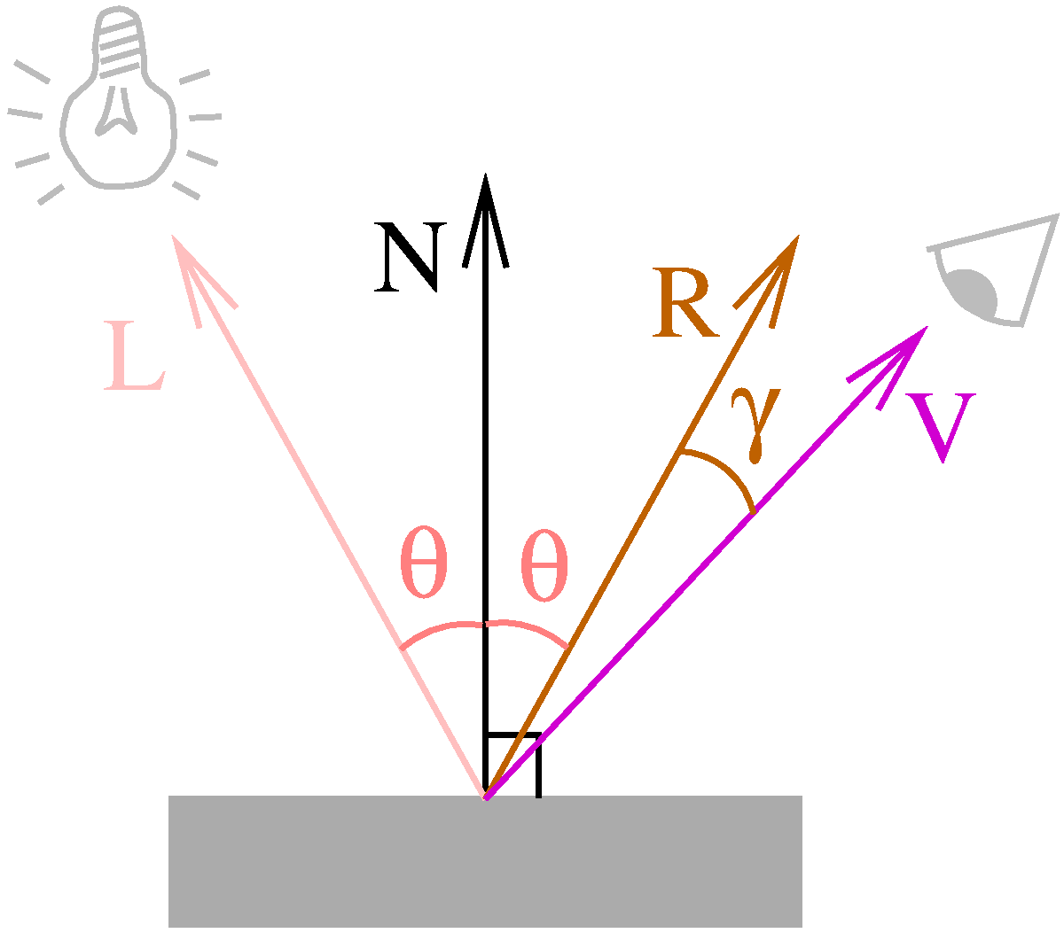 où \(S\) est la couleur spéculaire de la surface, \(C\) est l'intensité de la lumière incidente, \(m\) est l'exposant spéculaire. En normalisant tous les vecteurs on a \(\cos\gamma = R \cdot V\).
