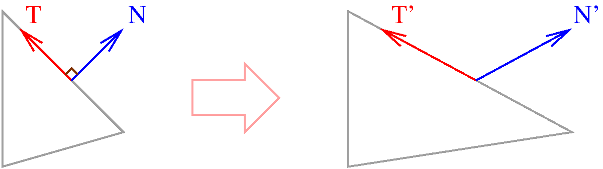 Soit \(T\) un vecteur tangeant à la surface et \(N\) un vecteur normal ; comme ils sont perpendiculaires on a \(N \cdot T = 0\). Soit \(M\) la matrice des transformations géométriques à appliquer, et \(G\) la matrice normale recherchée. On note \(T'= M T\) et \(N' = G N\) les résultats des transformations.