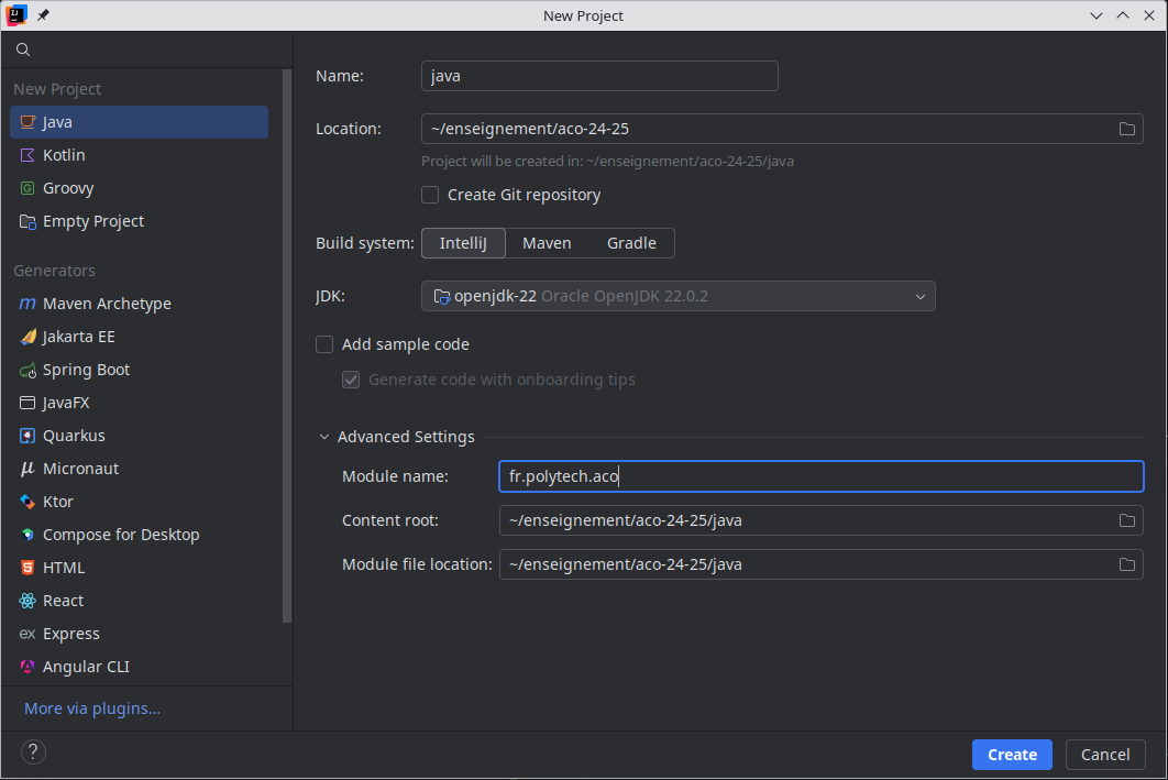 Pour terminer cette brève introduction aux modules, revenons sur le [fr.polytech.aco] vu dans la sous-section sur les packages. Lorsque l’on crée un projet avec IntelliJ, on nous demande, évidemment, le nom du projet (ici java comme indiqué tout en haut de la capture d’écran ci-dessous). Si l’on clique sur advanced settings, on peut voir que le projet est associé à un module. Par défaut, celui-ci porte le même nom que le projet mais on peut mettre un nom différent, ce que j’ai fait ici avec fr.polytech.aco. C’est donc avec ce nom que l’on pourra accéder à mon code si celui-ci est distribué.