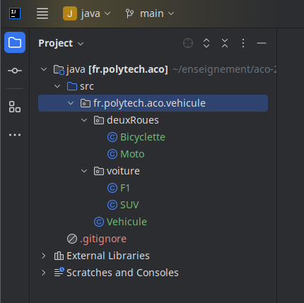 À l’intérieur du répertoire src, chaque sous-répertoire correspond à un package (ou sous-package s’il est lui-même inclus dans un répertoire). Ici, comme fr n’a qu’un enfant polytech, qui n’a qu’un enfant aco, qui n’a qu’un enfant vehicule, on peut considérer que le package racine, celui que l’on souhaiterait distribuer, est fr.polytech.aco.vehicule. Notez que l’on sépare les sous-répertoires par des « . », comme en Python.