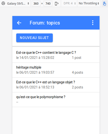 L'objectif des TPs est de continuer le développement du forum initié dans le module de développement d'applications web. En termes d'applications mobiles, il reproduira l'aspect de la capture d'écran ci-dessous :