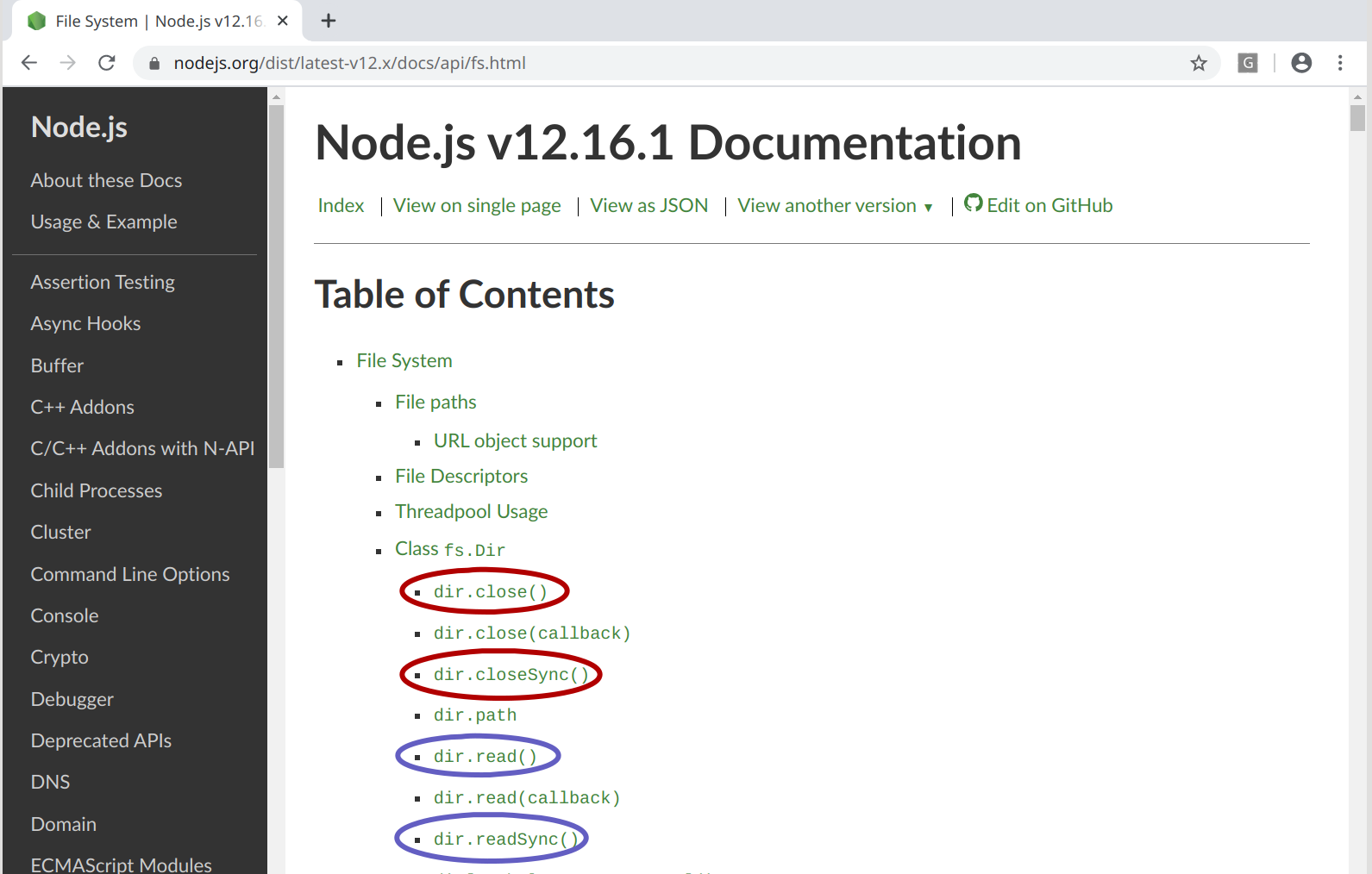 Le programme suivant permet d’afficher la liste des fichiers du répertoire courant. Dans la variable files, on récupère cette liste, puis on l’affiche. C’est donc un programme synchrone.