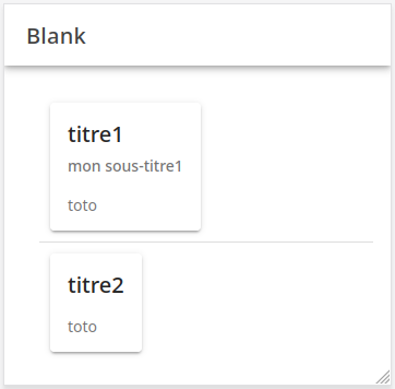 Une carte (card) est un composant ayant la forme d’une boite, qui contient un header ainsi qu’un contenu. Voici un exemple de cartes incluses dans une liste :