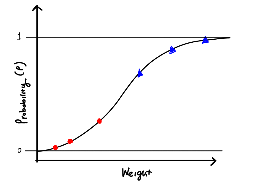 Our model will eventually look like this, where we have two classes of points, and for each point we give a probability (p) that our point belongs to a class.
