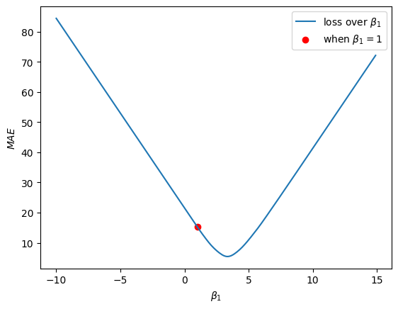 If we visualise our loss curve again, and visualise where \(\beta_1 = 1\) is on this curve, we will see: